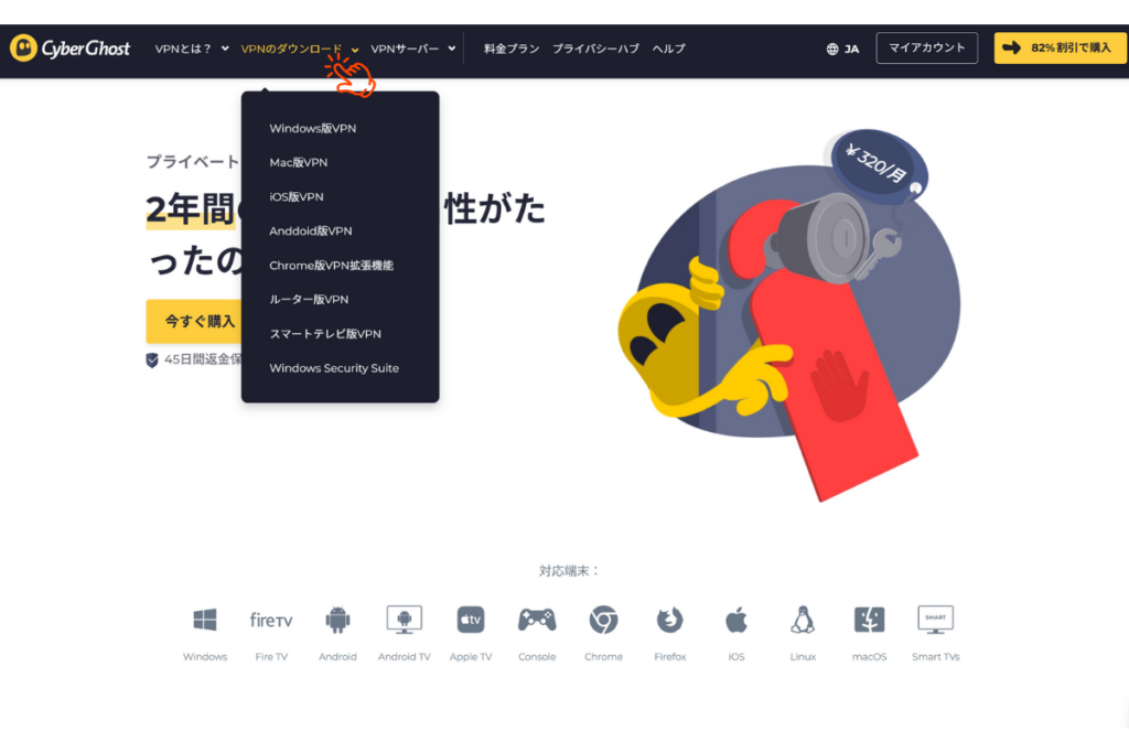 決済後、PCやスマートフォン、タブレットなど希望のデバイスにCyberGhostのアプリをダウンロード。アプリは日本語にも対応しており、インストールや設定は直感的で簡単です。