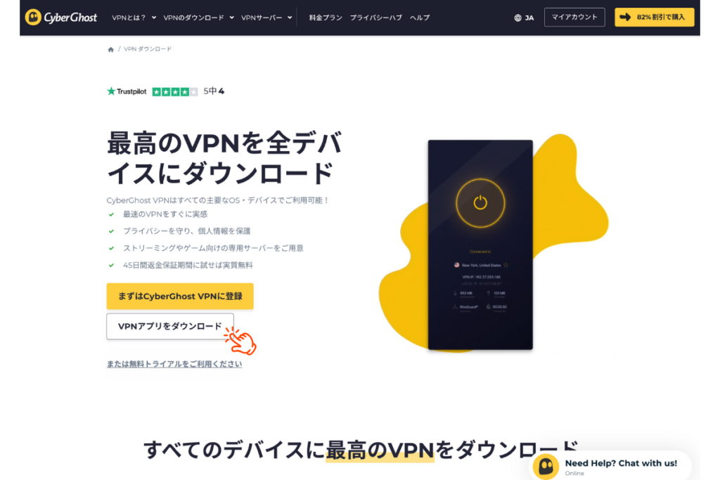 セキュリティ面では自動キルスイッチやDNSリーク防止などの機能も搭載されており、実際のCyberGhost VPN評判でも高い評価を得ています。カスタマーサポートは24時間対応ですが、日本語非対応のため、ご質問やトラブル時には英語によるやりとりが必要。